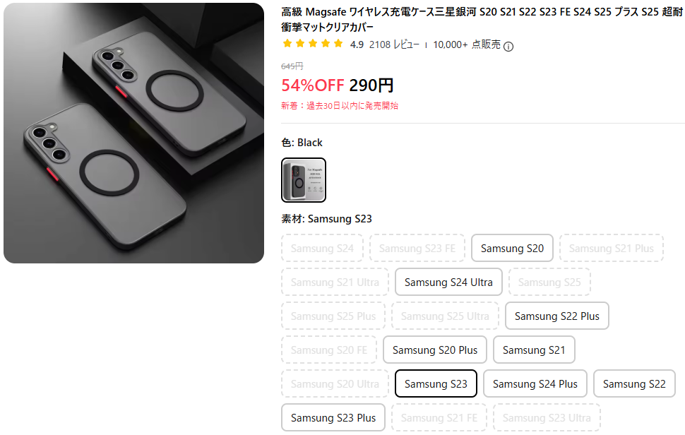 例えば私はGalaxy S20+を使っていますが、ページ上ではS25の写真しかなく、S20+版は選択できるだけ…なんてことがよくあります。